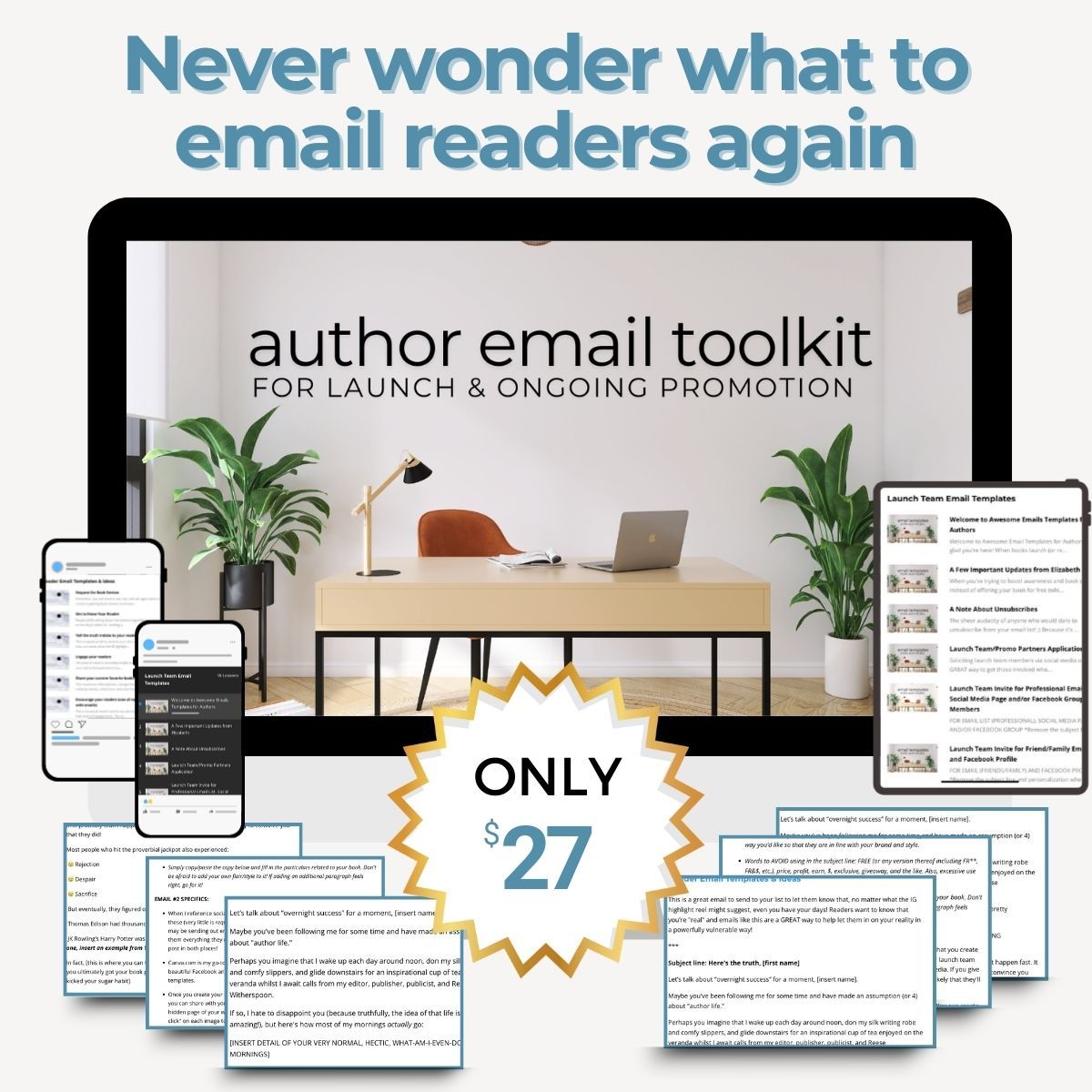 ⨠Create months of engaging emails without banging your head against your desk wondering, âWhat on earth do I say besides âbuy my bookâ?â